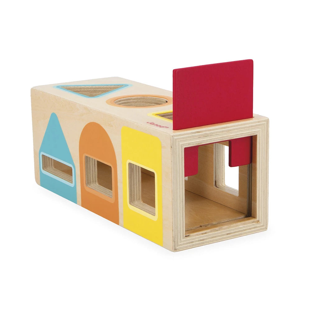 This appealing, cleverly designed box is the perfect way to start learning colours, with geometric shapes (triangle, circle, square) that your child has to push into the box through the right slot.