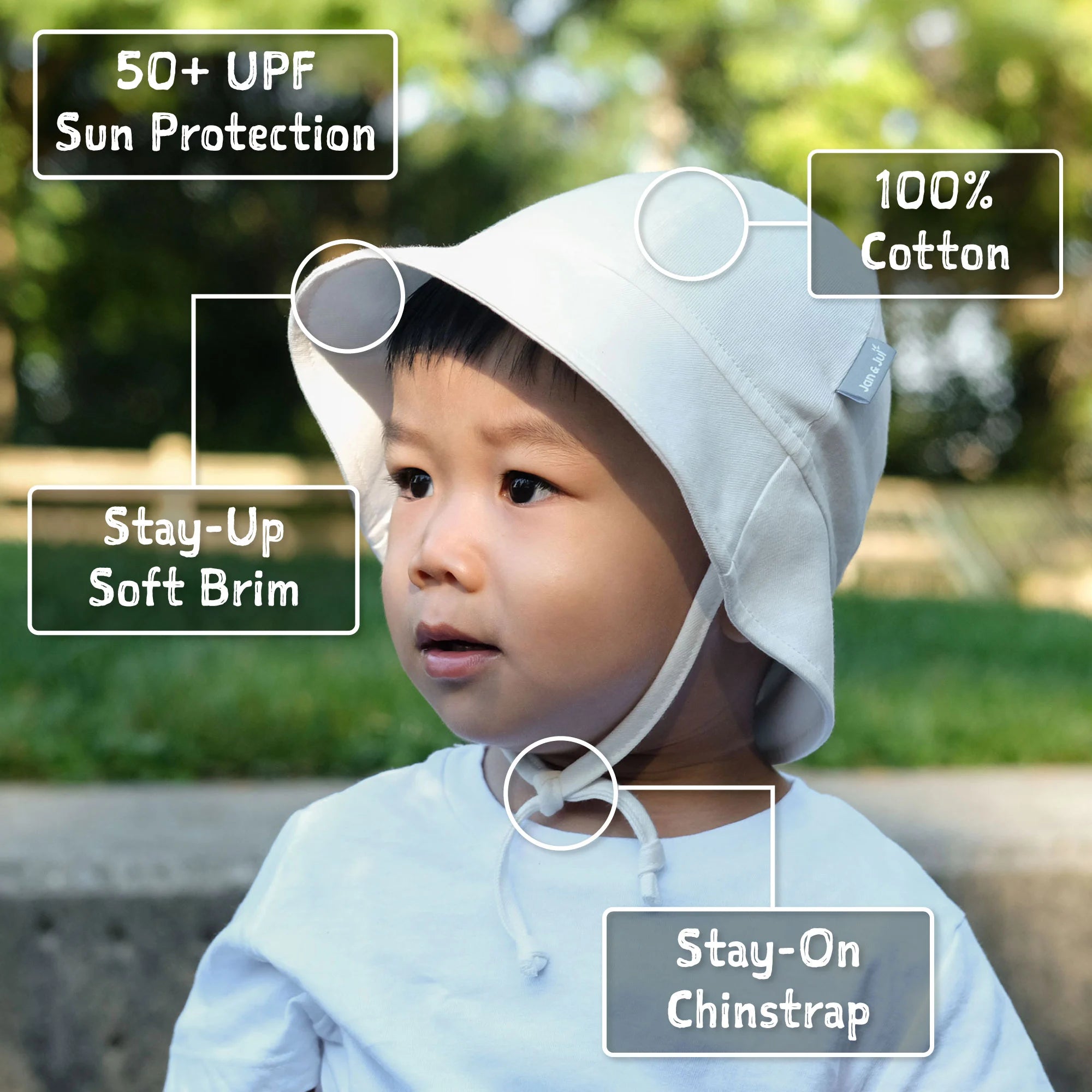 The UV protection from our cotton baby hats comes from the weave of the fabric and construction of the hat. Designed with a soft brim to comfortably shield your child's face, ears, and neck from the sun. Made with breathable, hypoallergenic 100% cotton that's super soft and stretchy. Rated UPF50+ and safe for babies' delicate skin with no harmful chemicals, PFAS, dyes, or solutions added.