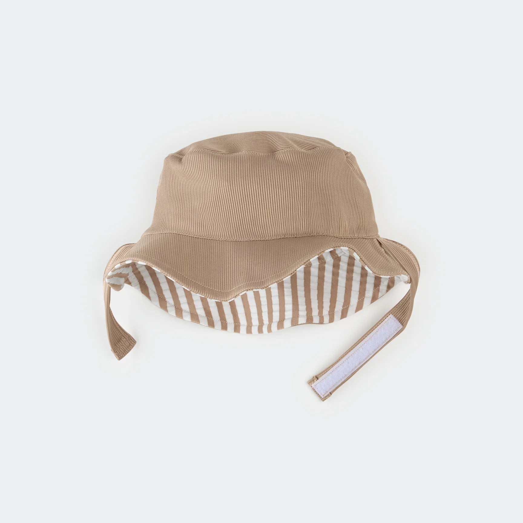 This simple taupe stripe hat compliments the swimwear available in the same range and matches mom and dad’s swimwear too. Perfect for keeping shaded while staying fully coordinated, the hat has a stripe on one side and is plain on the other. The wide brim shades their face and eyes from the sun whether splashing or strolling and the under-chin fastening keeps it in place all summer long.