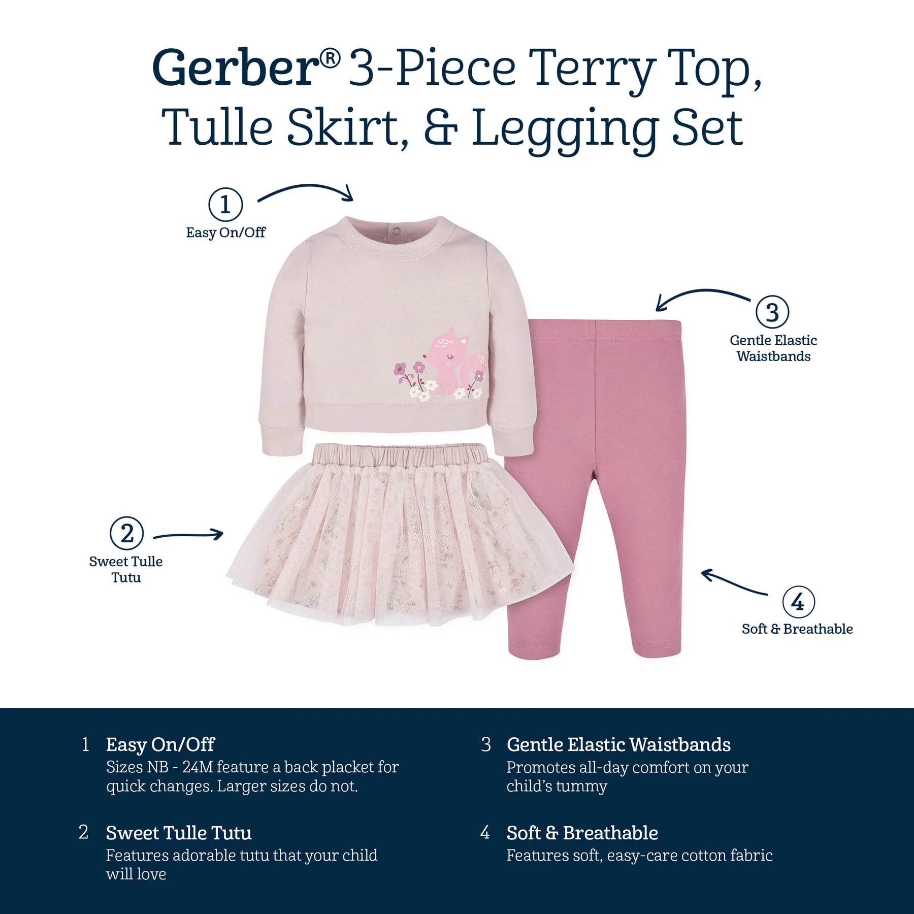 Gerber Baby 3-Piece Girls Woodland French Terry Top & Tulle Tutu