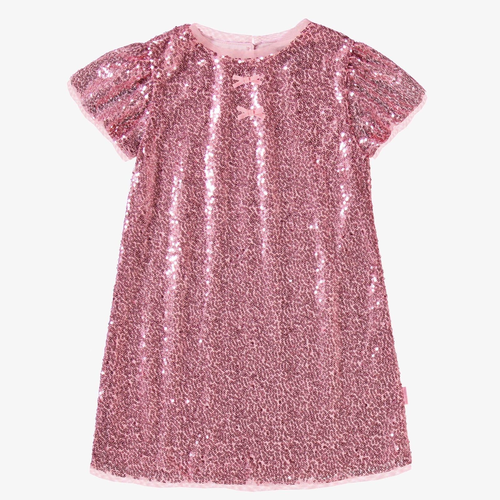 This pink glitter dress adds a touch of shimmer to any occasion. It features a round neckline and short flutter sleeves for a playful and chic style.
