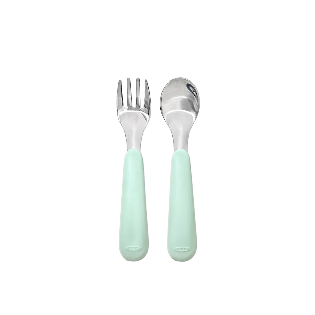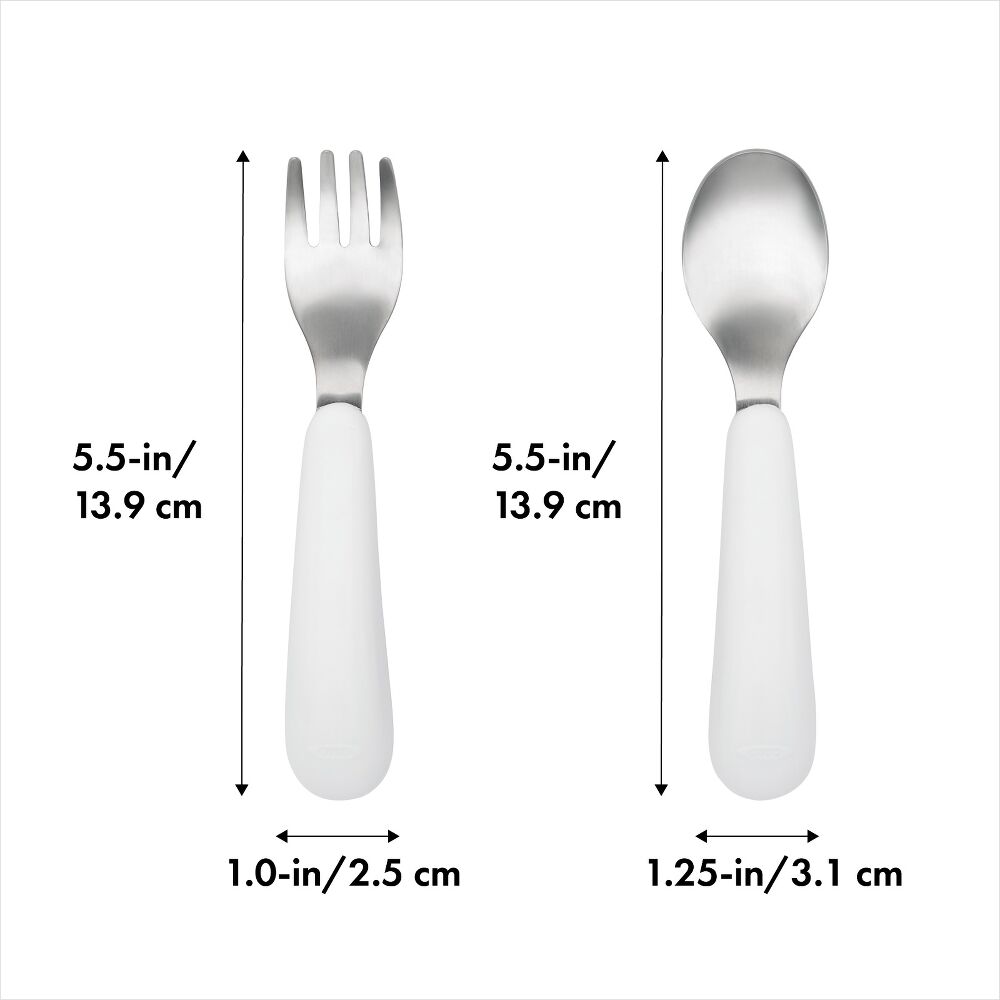 OXO Tot Fork & Spoon Set make it easy for young eaters to get their food from dish to mouth. A flat spot on the handles prevents the fork and spoon from rolling off the table or high chair tray, and the soft grips are shaped to keep them from sliding into bowls or plates.