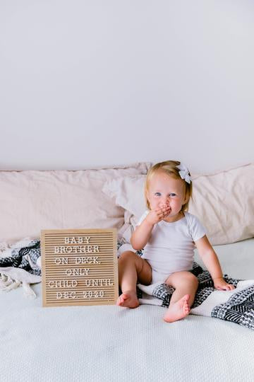 Modern, trendy and fun, Pearhead’s wooden letterboard is the perfect addition to your little one’s nursery and your Instagram pictures. This wooden letterboard includes 188 white letters, numbers, and symbols to personalize and customize your board for all your pictures. Have fun adding in your baby’s due date and snap a picture of the board next to your pregnant belly. Once baby joins the world, share their birth announcement with this letterboard and add their name, birthdate, and weight. Everyone will love being able to see your adorable little baby and send their well wishes! This board can also be used for your baby’s monthly posts. The easel makes it easy to prop up next to baby for their pictures and display their message. With the plastic letters included you can have fun personalizing your pictures from month to month. Include things like baby’s favorite foods to their height and weight. Not using it as a monthly picture board? No problem! This letterboard can be used for any special picture, announcement, or moment. The natural wooden board also includes a sawtooth hanger to easily hang on your wall. Every day you can include a new message for the entire family to see! This letterboard makes the perfect gift for anyone expecting a baby or just because! Have fun wrapping it up and gifting for that special occasion. Use Pearhead’s wooden letterboard for your fun monthly baby pictures or for any fun pictures! Snap, post, and love! Use the hashtag #mylittlepearhead for a chance to be featured on Pearhead’s social pages. Product dimensions: 10” W x 10” H x .5” D
