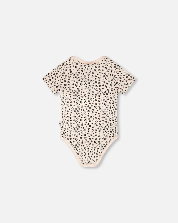 The evolutive organic cotton jersey onesie peach with animal print is a sweet everyday essential for baby girls. This short-sleeve bodysuit features an envelope neckline for easy changes, bottom snap closures, and a delicate allover animal print. The leg snap button closure is evolutive to adapt as she grows. Crafted from soft organic cotton with a touch of stretch, it ensures breathability and comfort throughout the day. Perfect for naps, playtime, or layering under dresses and overalls, this piece blends practicality with gentle charm. A lovely addition from our "Savannah Whispers" collection to brighten the season.