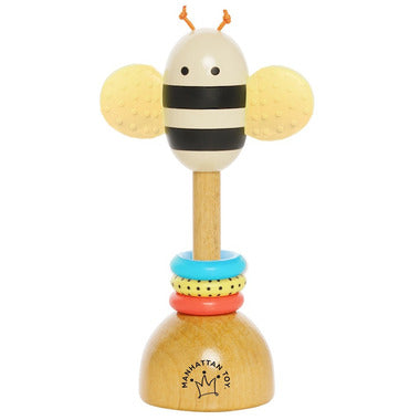 The nursery will be buzzing with delight when our Brilliant Bee Rattle is among the collection of baby's first toys. Uniquely designed with light-up capabilities, the various shapes and materials will keep little one's curious hands exploring the beech wood dowel rod, soft and hard plastic teething rings that clack and rattle with every shake, the exciting light-up bumble bee with textile antennae. Baby toy will encourage cause and effect learning while providing auditory stimulation.