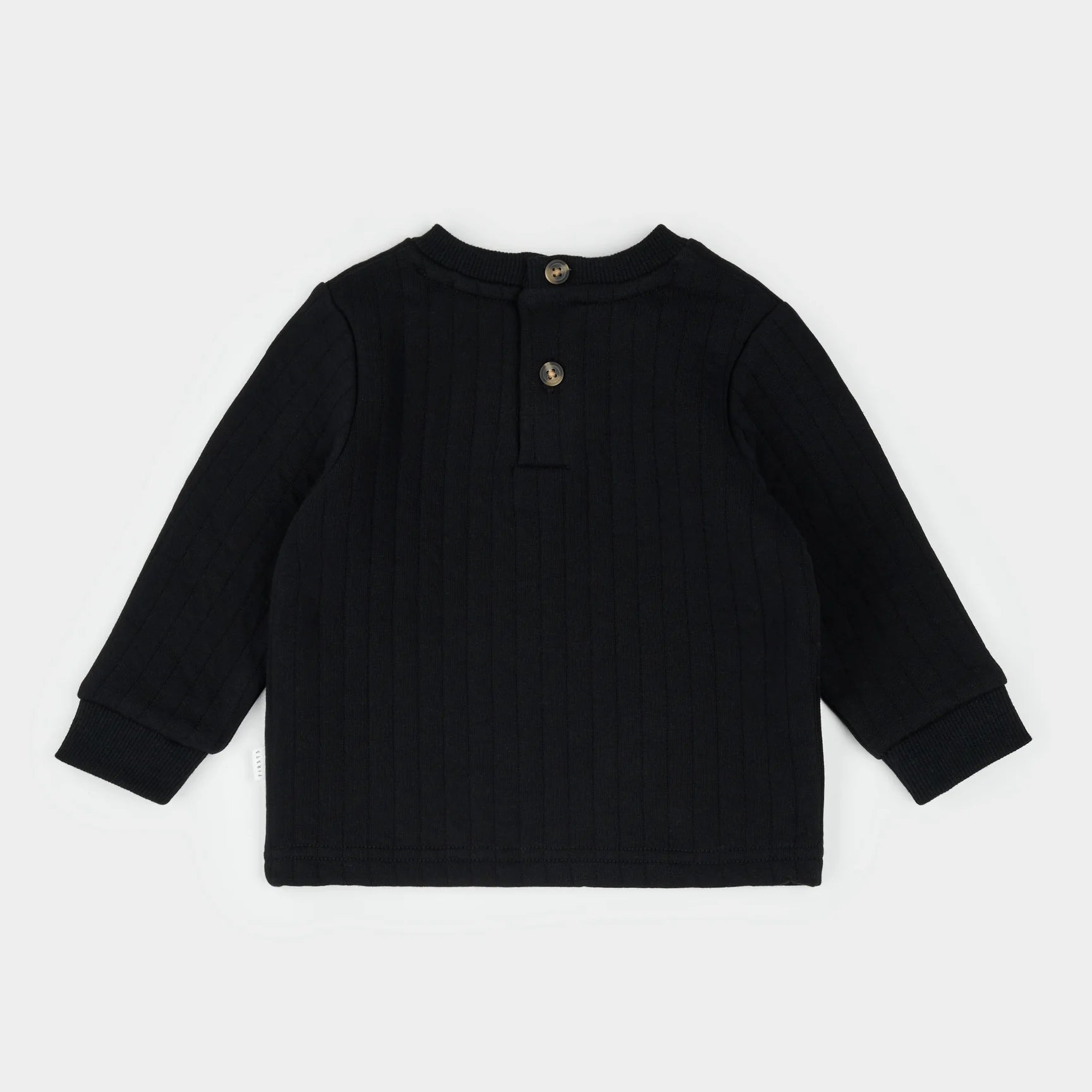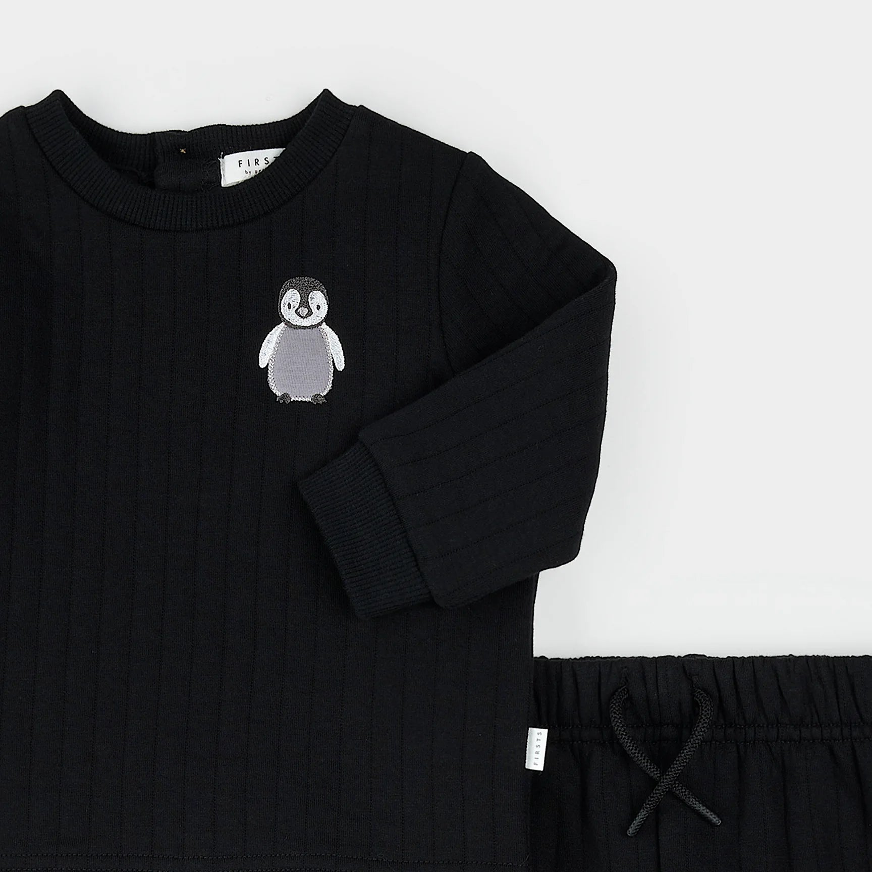 Cozy and practical, this black 2-piece set is perfect for messy eaters or mud-dwellers and is made from a warm yet flexible quilted jersey. With a button placket at the back of the top and a simple elasticated waistband on the pants, the set is easy to pull on for get-up-and-go mornings. Featuring an adorable penguin design, it’s perfect for the littlest member of the fam.