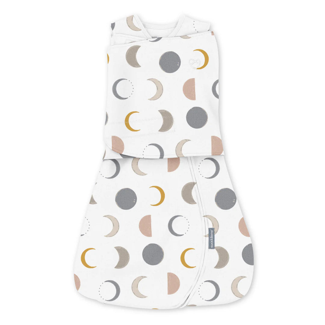 This Stage 2 swaddle has an easy-to-use adjustable wrap that helps baby transition from sleeping with arms in to arms out. Soft adjustable wings wrap around baby to create a snug, womb-like feeling when baby is sleeping with arms in. Once your little one is developmentally ready to roll and self-soothe with their hands, simply adjust the hook-and-loop closure on the wings, position baby with one or both arms out, and press to secure. The cozy fit of this swaddle helps prevent the startle reflex that can wake baby, but the hip-healthy design leaves plenty of room to move. The large zipper opening of the swaddle makes getting in an out easier & diaper changes a breeze.