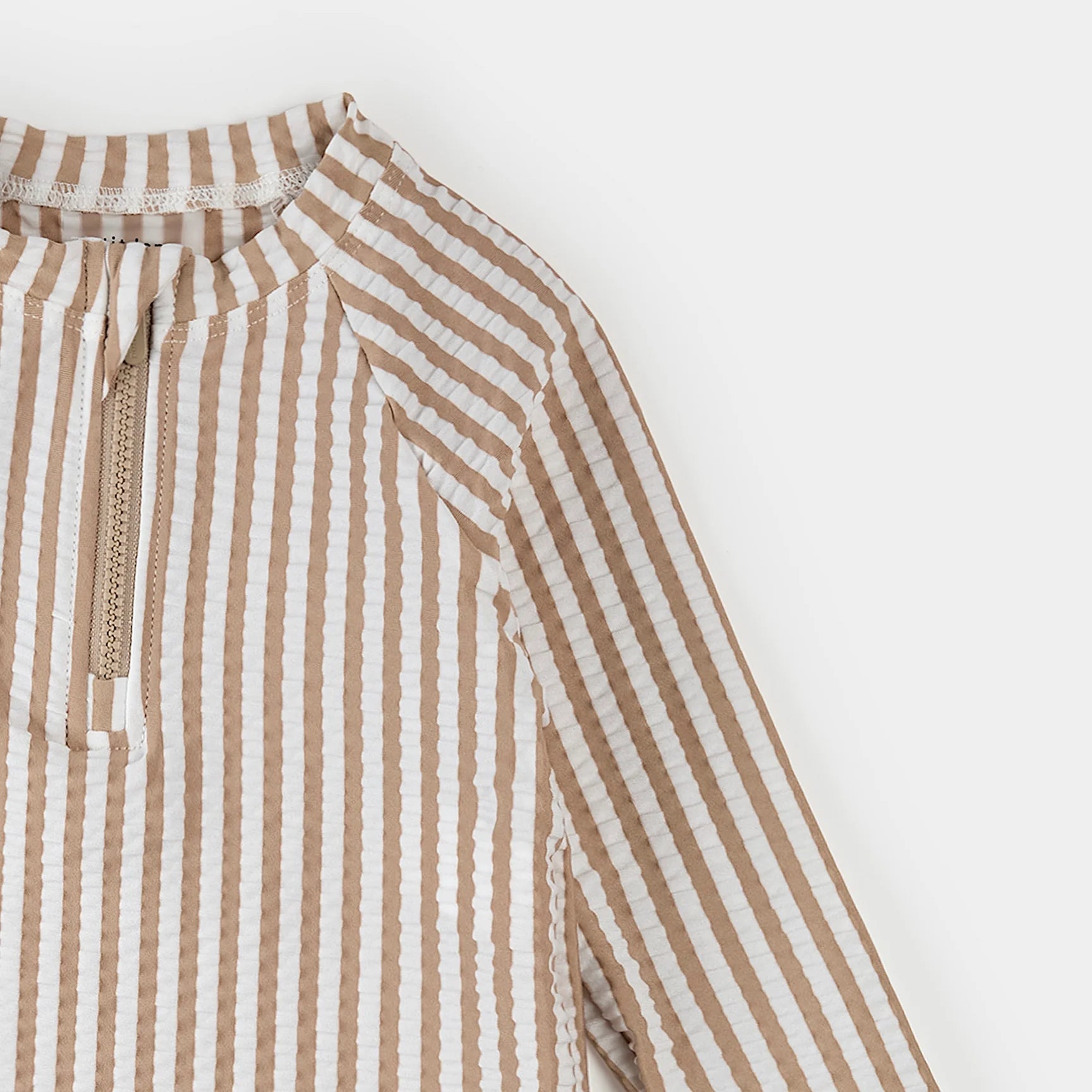 Classic, comfortable, and ready for sunny, family adventures, this taupe stripe, 2-piece set is made with stretchy, quick-drying fabrics and built-in UPF50+. The set includes a long-sleeved, seersucker rash guard and coordinating swim shorts with a textured finish. Designed for full coverage and easy movement, the set is perfect for pool days, beach adventures, and seaside play. There’s a sun hat available for added protection and coordinating swimwear for the whole family. Vacay pics are a must.