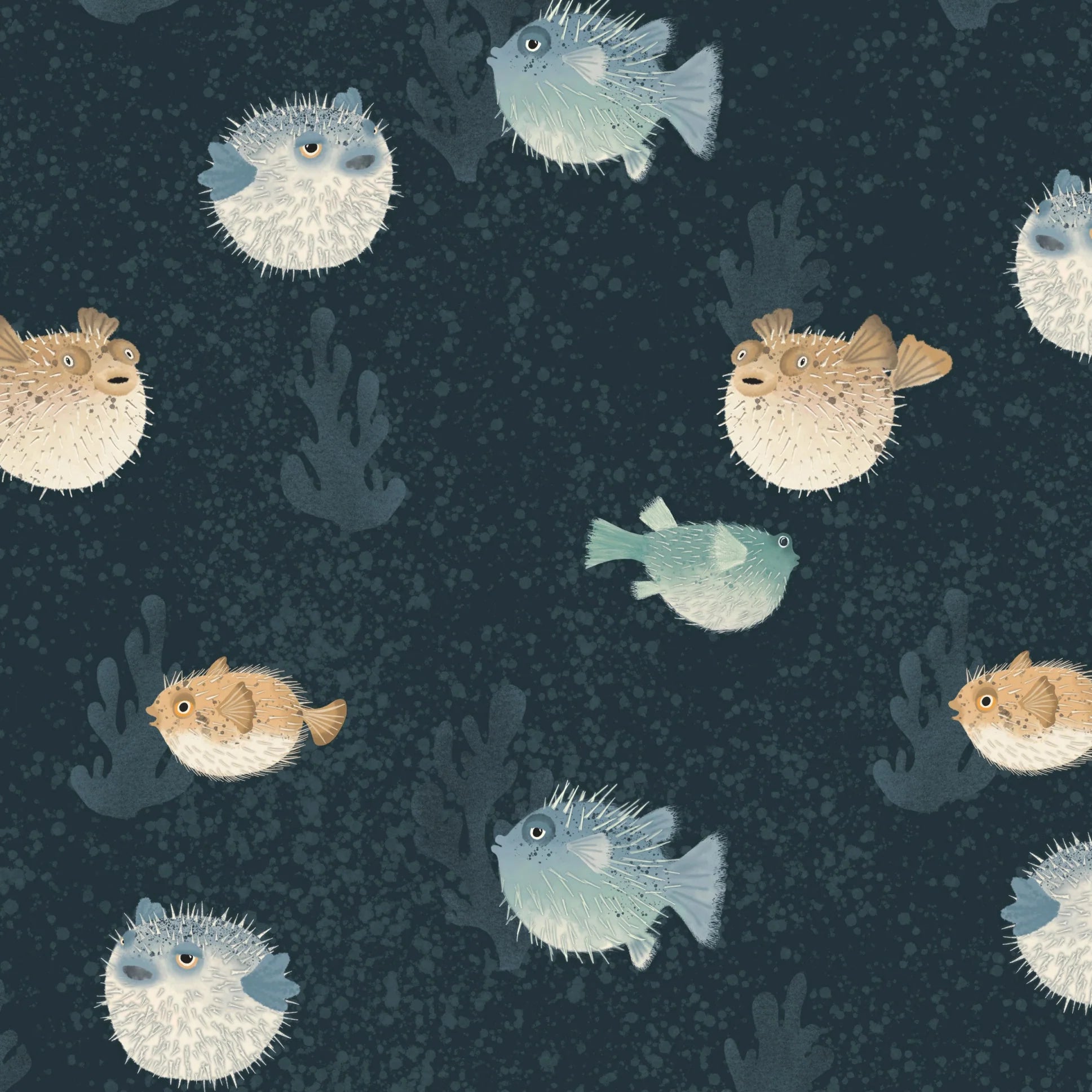 The "Brooks" is our print of the year, featuring the cutest hand drawn pufferfish around on a bubble blue navy base.  Blues, Greens, Browns + a touch a Mint - this may just be the easiest print to accessorize we have ever done.