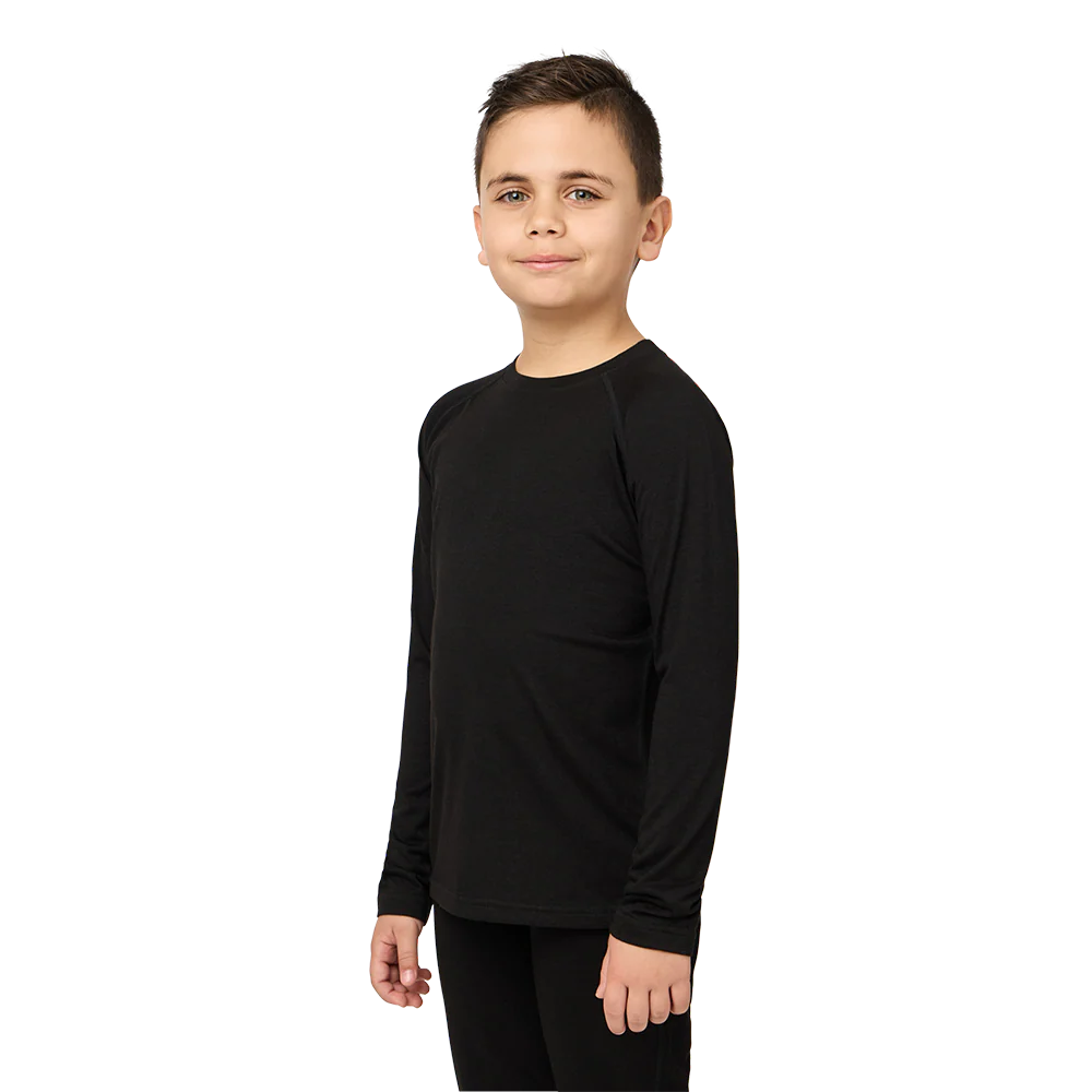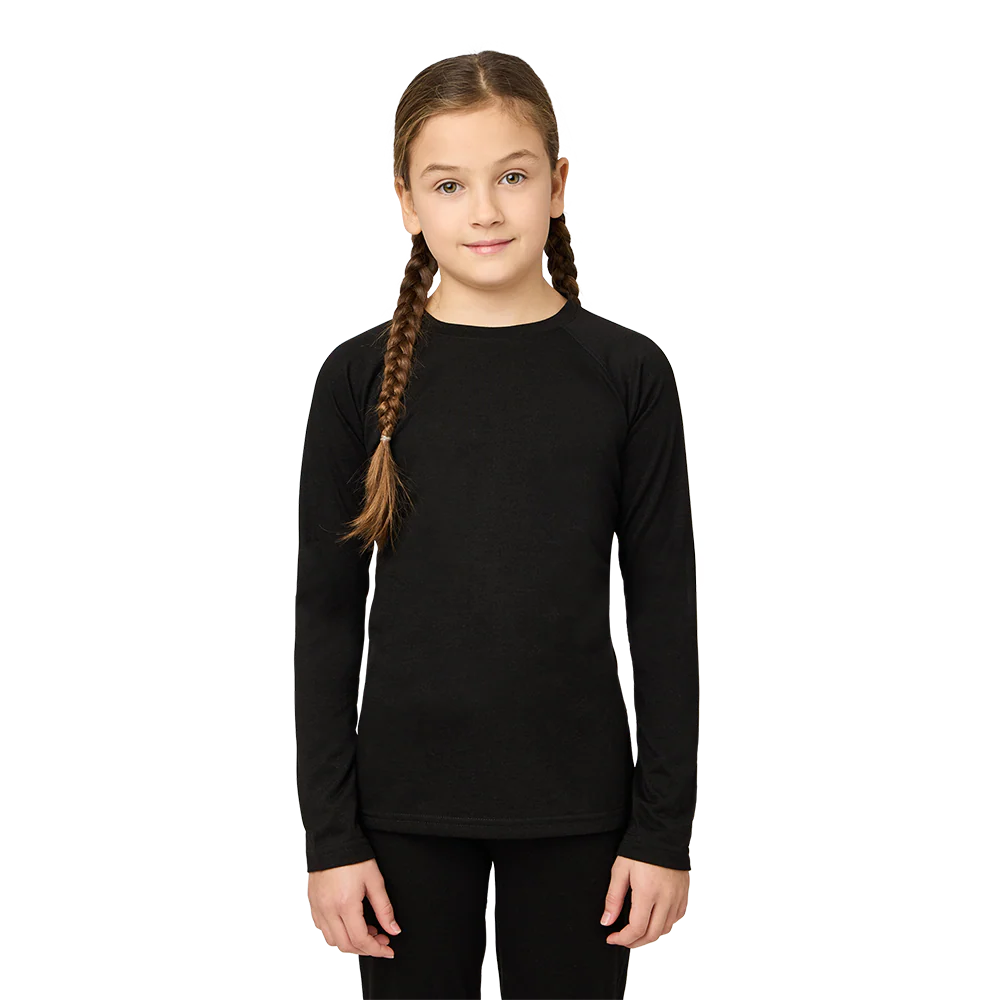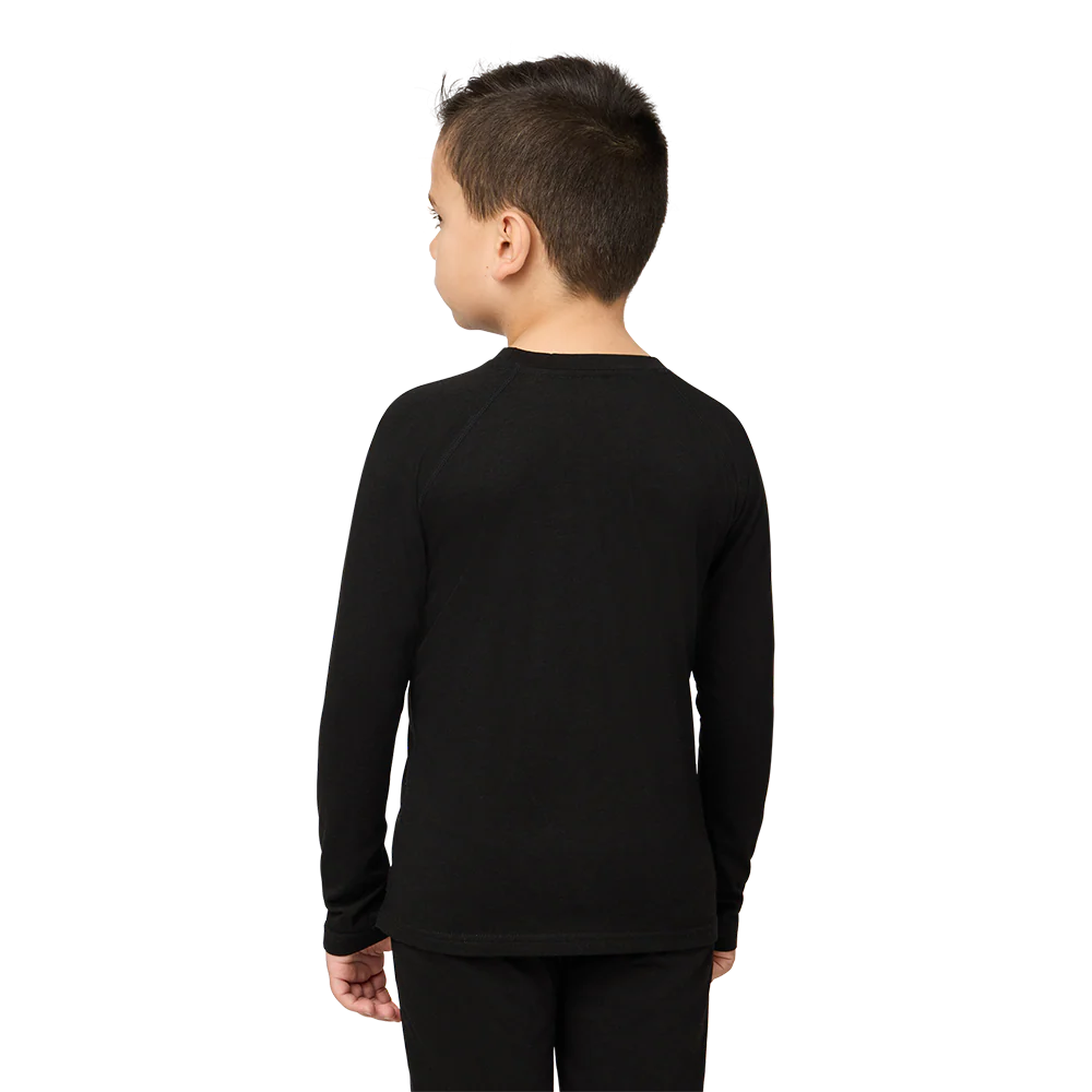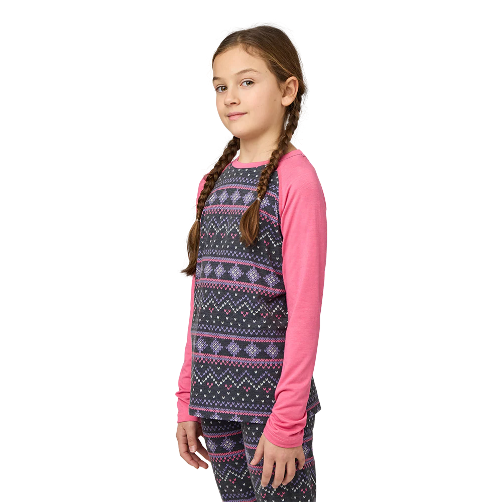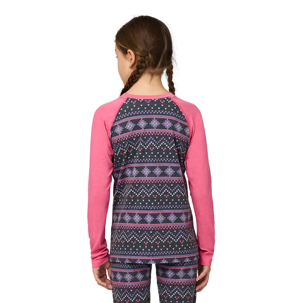 This midweight juniors’ crew blends mulesed-free Merino wool and ACCU-DRI® tech for warm, breathable layering. Naturally antimicrobial and stretchy, it’s soft enough for everyday adventure. Raglan sleeves and flatlock seams keep kids comfy on the move. Pair it with the matching pant for full-body coziness.